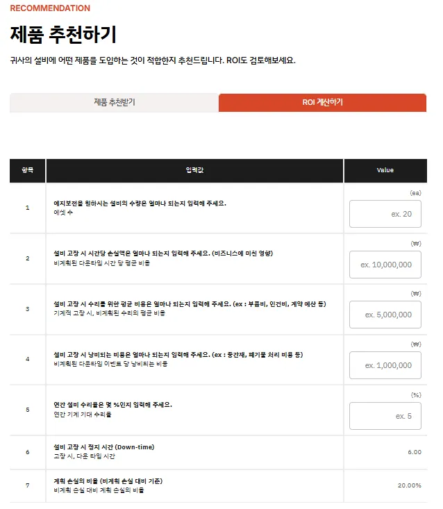 모터센스 홈페이지 ROI 계산하기 페이지 모습
