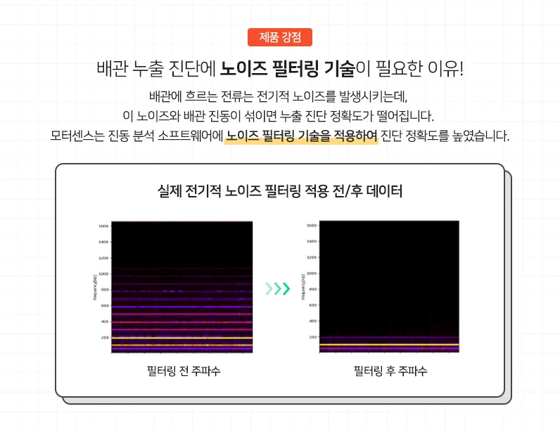 앞서 말씀드렸던 것처럼 누출을 잡아내기 어려운 환경이라 적절한 솔루션을 제공해줄 수 있는 여러 업체에 예지보전을 의뢰해봤는데요. 이런 시도에도 워낙 현장이 까다로워 만족스러운 결과를 얻지 못했습니다. 이에 반해 모터센스는 블라인드 테스트에서 93%로 가장 높은 정확도를 보여주어 선택하게 되었습니다.실제 도입성과도 좋았습니다.배관의 전류 노이즈를 필터링하고 배관 자체의 진동만을 수집하는 기술을 통해 순수한 설비데이터만 선별할 수 있어 누출을 정확하게 감지하더군요.